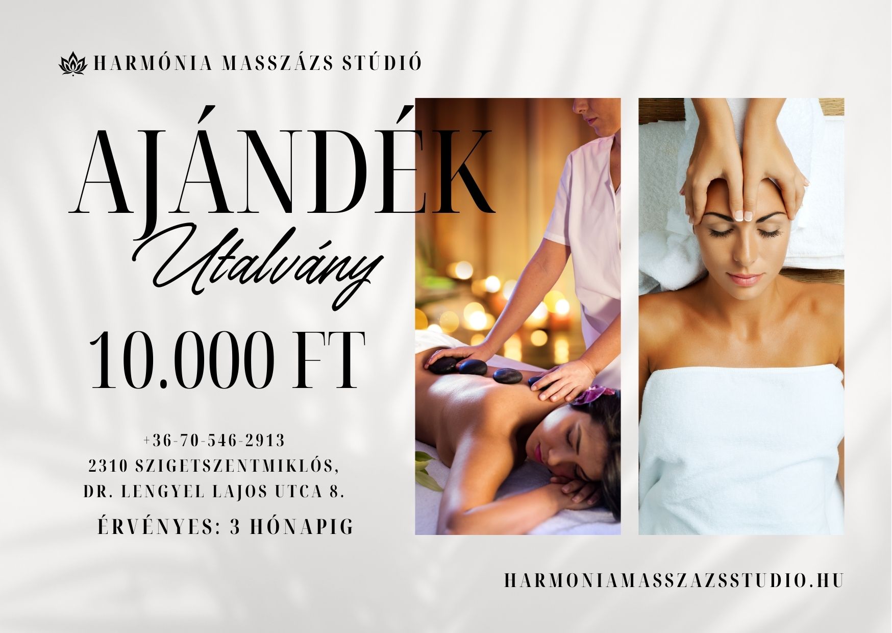 A Harmónia Masszázs Stúdió ajándékutalványai bármelyik kezelésre beválthatók, vagy választhatsz egy tetszőleges értékű utalványt is, ha a megajándékozott maga szeretne dönteni. Egy ilyen figyelmességgel nemcsak testi kényeztetést adsz – hanem időt, nyugalmat és új energiát is.