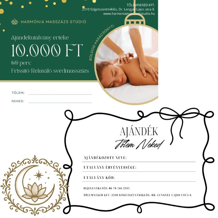 Ajándékozz valódi pihenést és meghitt ünnepi harmóniát! A Harmónia Masszázs Stúdió Karácsonyi Ajándékutalványa tökéletes választás, ha szeretnéd, hogy szeretted kiszakadjon az év végi rohanásból, és átéljen egy mély, feltöltő masszázsélményt. Finom illatok, meleg hangulat, teljes testi-lelki megújulás várja — ez az ajándék valóban a szeretetről szól.