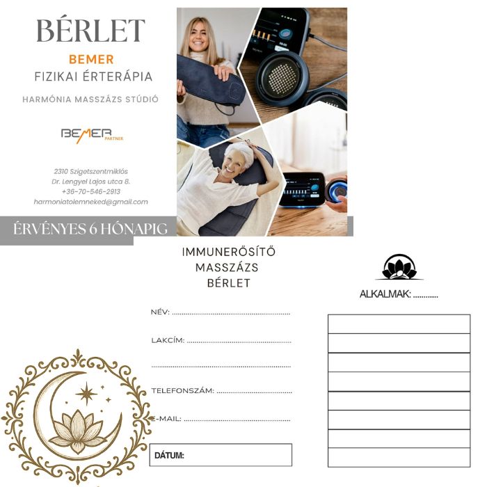 A BEMER terápia speciális, pulzáló elektromágneses mező segítségével támogatja a mikrokeringést, ezáltal hozzájárul a sejtek jobb oxigén- és tápanyagellátásához. Gyengéd, mégis hatékony kiegészítő kezelés, amely jól beilleszthető a mindennapokba.